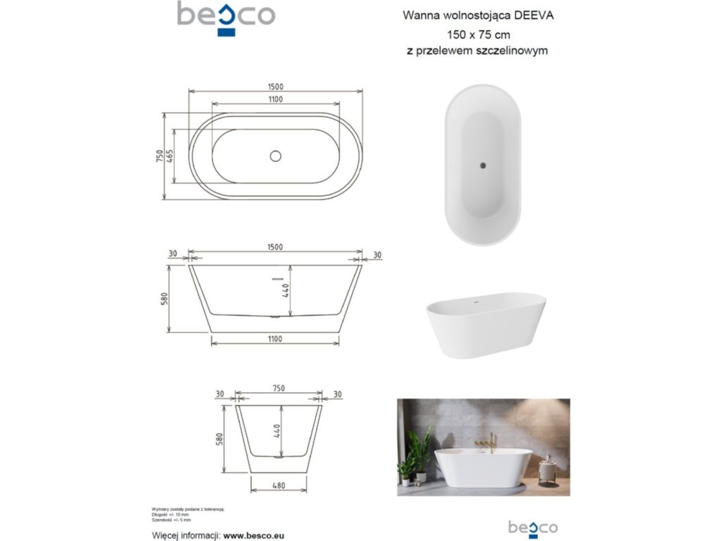 Asymetrická volně stojící vana DEEVA se vyrábí ve třech rozměrech. Krásná masivní vana z prvotřídního sanitárního akrylátu. Konstrukce vany nevyžaduje obklad ani obezdění. Proti mramorovým vanám má nižší hmotnost a snadno se s ní manipuluje. Součástí vany je také odtokový systém click-clack (v barvě chrom je jako standardním provedení) se štěrbinovým přepadem. Dále nabízíme tento sifon bez příplatku v dalších 4 barvách (zlatá, černá, bílá a grafitová).