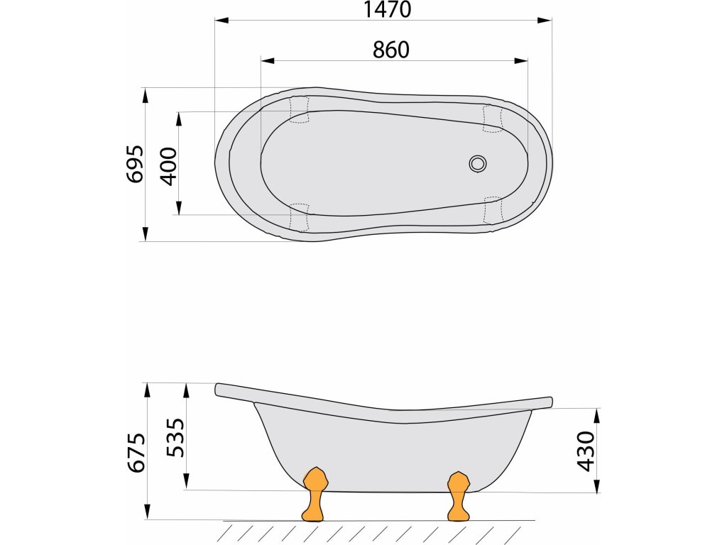 RETRO volně stojící vana 147x69,5x67,5cm, nohy bronz, bílá 85356