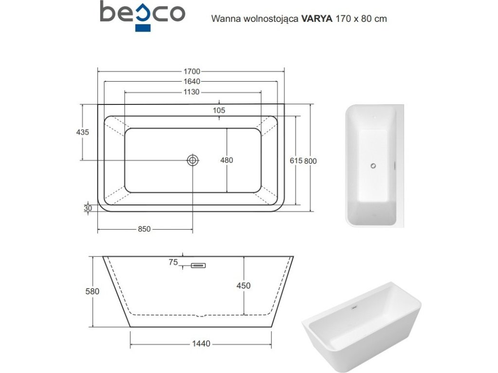 Symetrická vaňa VARYA na inštaláciu k stene v dvoch praktických rozmeroch 150 x 75 cm alebo 170 x 80 cm, robustná konštrukcia a jemný moderný dizajn. Vaňa je vyrobená z kvalitného akrylátu . Vďaka tomu má praktickú hmotnosť a je dostatočne pevná . Vaňu je možné umiestniť k stene. Výhodou je jednoduchá inštalácia, nie je nutné podmurovanie ani obklad vane. Súčasťou vane je aj odtokový systém click-clack s prepadom v chróme v štandardnom prevedení. Ďalej ponúkame tieto sifóny za príplatok v ďalších 4 farbách (zlatá, čierna, biela a grafitová).