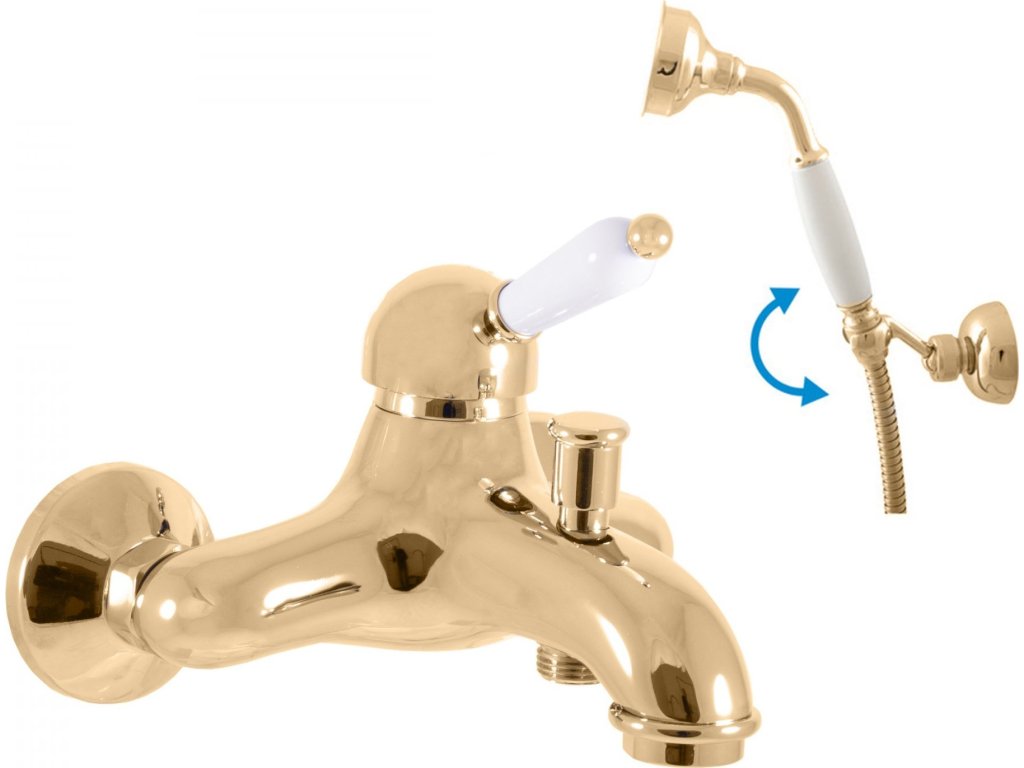Retro Vodovodní baterie vanová nástěnná se sprchou a otočným držákem, s keramickou páčkou.