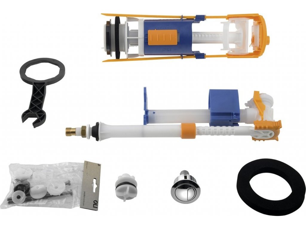 Úsporný splachovací mechanismus s duálním tlačítkem pro WC kombi, spodní přívod.