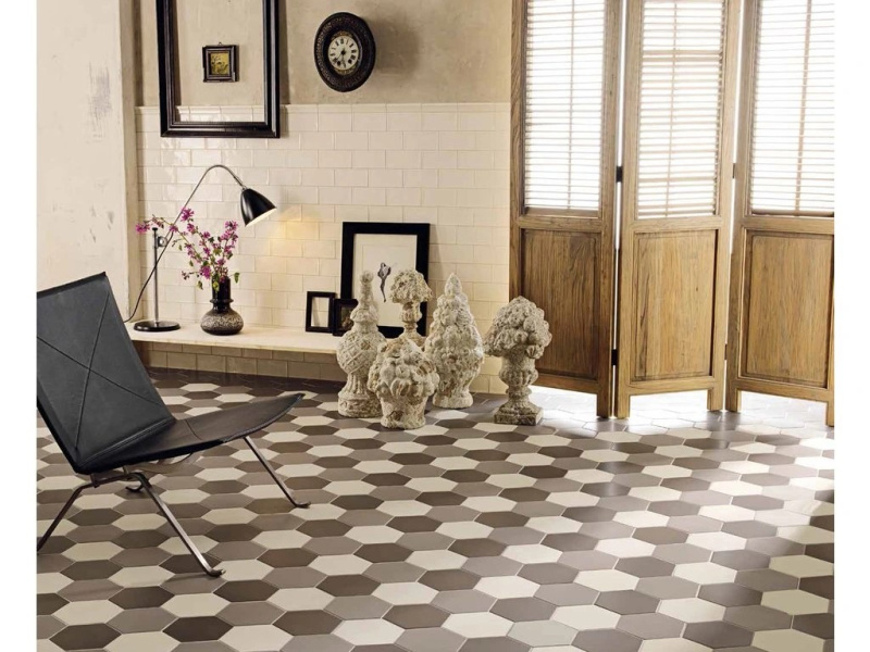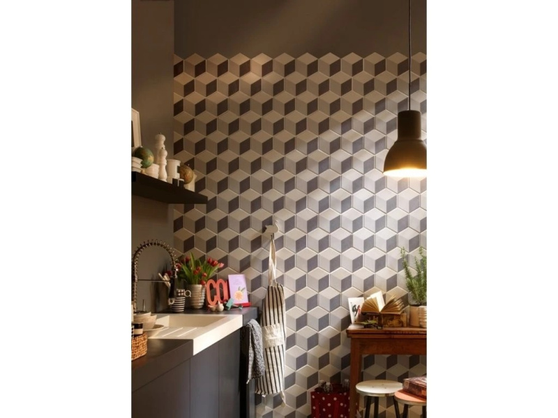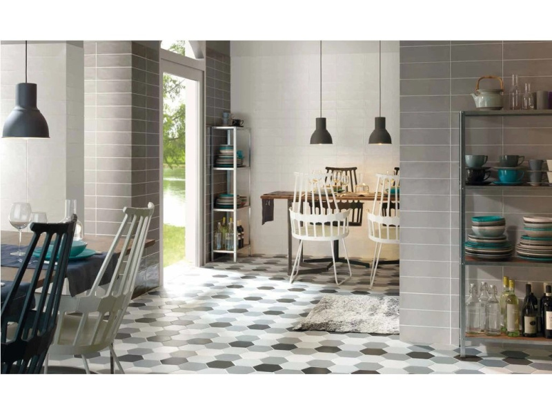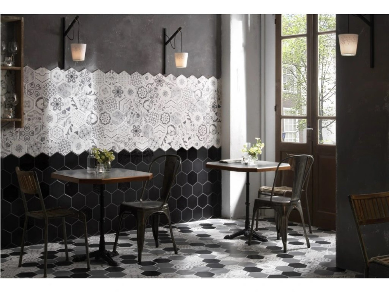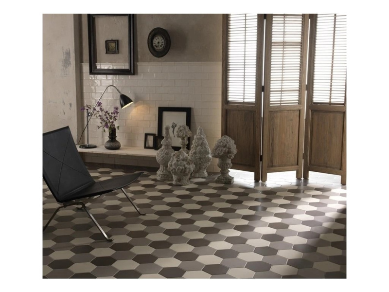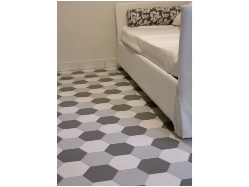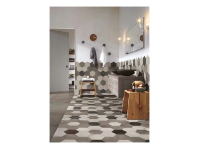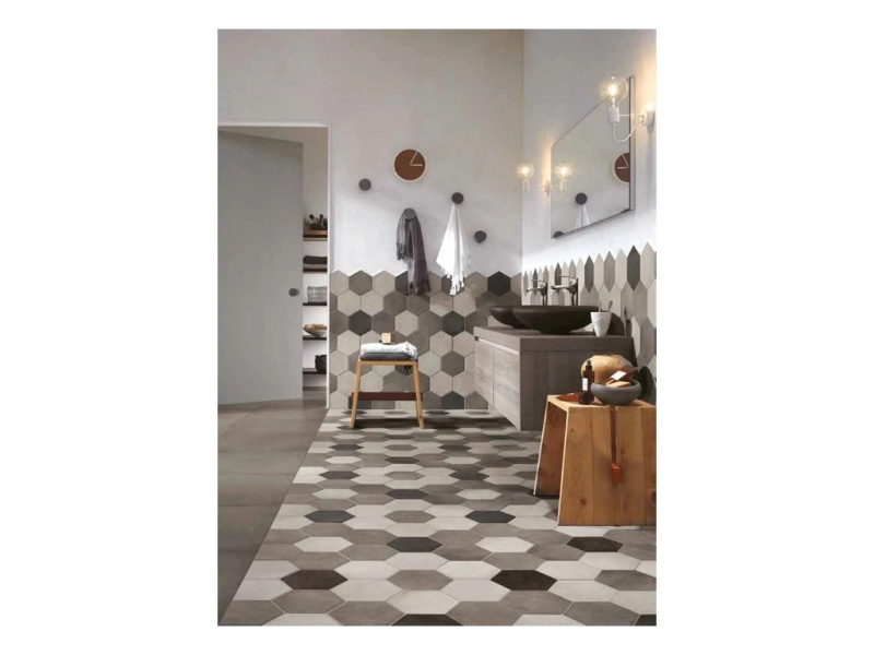 Tonalite Examatt je matná hexagonální kolekce o formátu 15×17,1 cm a tloušťce cca 8 mm, navržená pro kreativní skládání na stěnách i podlahách interiéru. Nabízí 8 nadčasových barev – Avorio, Bianco, Grigio Chiaro, Grigio Medio, Mosto, Nero, Sand a Tabacco – a také dekorové mixy, se kterými snadno vytvoříte od jemných přechodů až po výrazné retro „kobercové“ vzory. Šestiúhelníkový tvar umožňuje nekonečné kombinace (květové motivy, gradienty, zubaté zakončení obkladu), takže se kolekce hodí do koupelen, kuchyní, chodeb i kavárenských či butikových interiérů. Matný povrch působí klidně a příjemně na dotek, přitom vynikne kresba spár a geometrie pokládky.