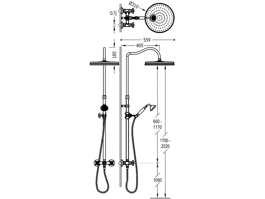 Pevná sprcha O 310 mm s kloubem. (299.337.03). Ruční sprcha, proti usaz. vod. kamene. (299.631.09). Teleskopická tyč.